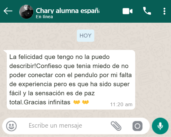 A medida que avanzaba, comprendí que este era el camino que siempre había buscado. No solo para mí, sino para ayudar a otros a encontrar paz, claridad y equilibrio en sus vidas. Hoy, después de 15 años como radiestesista profesional, quiero compartir contigo todo lo que aprendí. A través de mis talleres y cursos online, he tenido la oportunidad de ayudar a miles de personas a lo largo del mundo a transformar sus vidas usando el péndulo como herramienta.